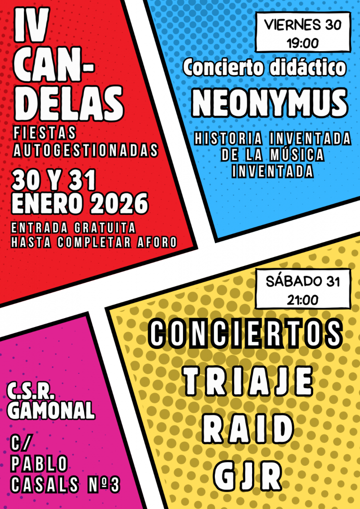 El programa de estas IV Fiestas Autogestionadas de las Candelas se desarrollará durante el viernes 30 y el sábado 31 de enero y contará con varios conciertos y actuaciones musicales para todos los públicos. El viernes 30 de enero, a partir de las 19:00 horas, el CSR acogerá el concierto didáctico Historia inventada de la música inventada que surge propuesta familiar del polifacético artista Neonymus. Por su parte, el sábado 31 de enero, a partir de las 21:00 horas, llegará el turno de los amantes del punk-rock y la música más cañera con las bandas burgalesas RAID, GJR y TRIAJE. Como de costumbre en el CSR, la entrada es libre y gratuita hasta completar el aforo.