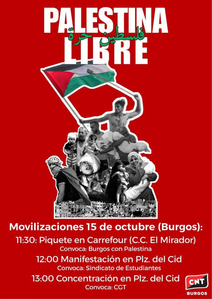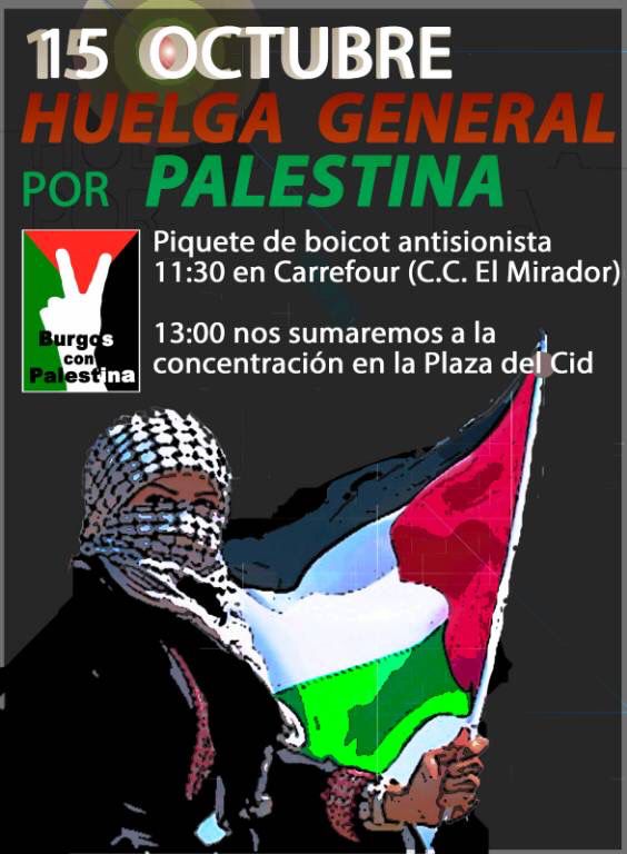 El próximo miércoles, 15 de octubre, se ha convocado una jornada de movilización y Huelga General por Palestina. En Burgos se llevaran acabo una serie de iniciativas e solidaridad con el pueblo palestino y contra el genocidio cometido por el Estado de Israel. Se puede seguir el programa de movilizaciones a través del siguiente cartel que publicamos a continuación.