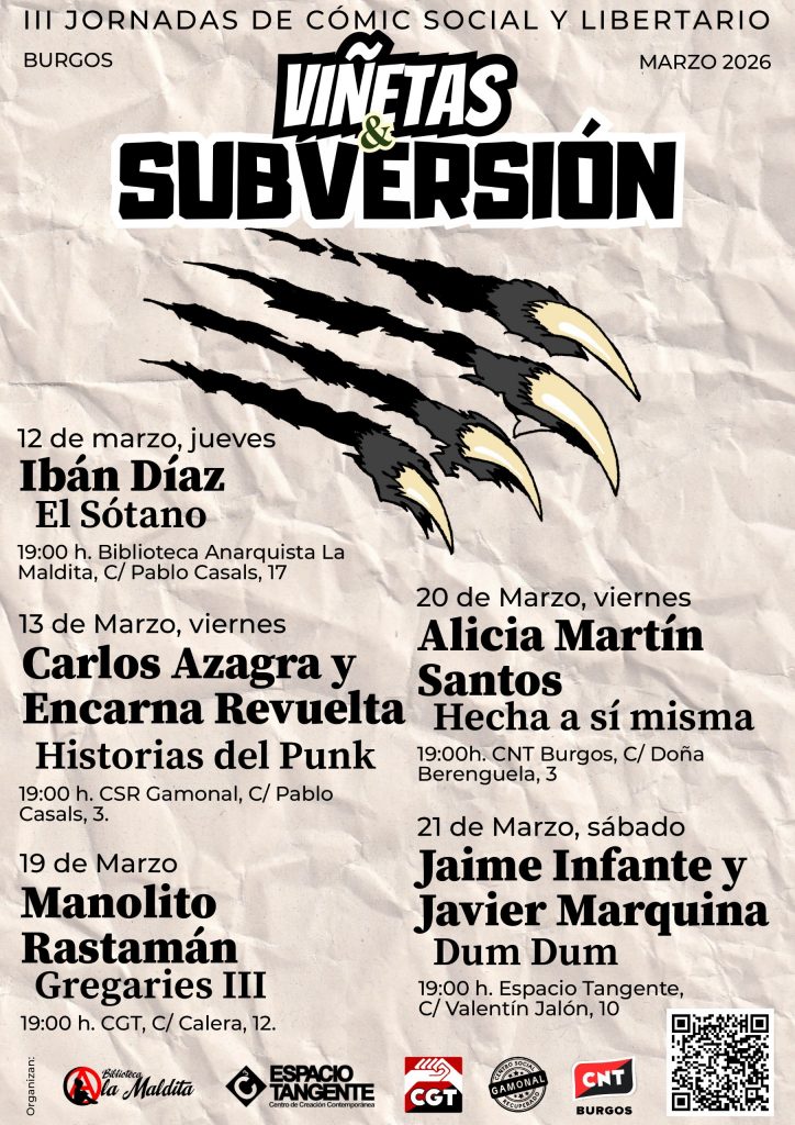 Para conocer más detalles acerca de esta nueva edición de Viñetas & Subversión, os remitimos al programa oficial donde figuran las cinco sesiones que componen las III Jornadas de Cómic Social y Libertario de Burgos.