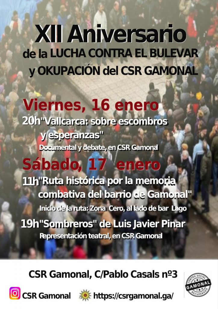 Durante el presente mes de enero de 2026 se cumplirán 12 años de la revuelta de Gamonal contra la construcción de aquel bulevar proyectado en la calle Vitoria y de la apertura del Centro Social Recuperado. Desde el CSR han organizado un programa de actividades para poner en valor aquellos acontecimientos vividos hace ya más de una década.